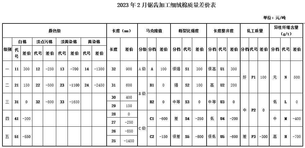 2023年2月中棉协《国产棉质量差价表》