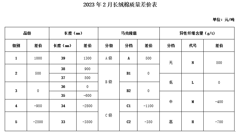 依据2023年1月的棉花公检质量数据、中国棉花协会棉花质量价差自动生成系统采集的棉花加工企业销售成交价、纺织企业监测点的采集数据以及当月的中国棉花价格指数,并征求业内相关专家的意见,与上月相比,2023年2月《锯齿加工细绒棉质量差价表》、《皮辊加工细绒棉质量差价表》和《长绒棉质量差价表》保持不变。