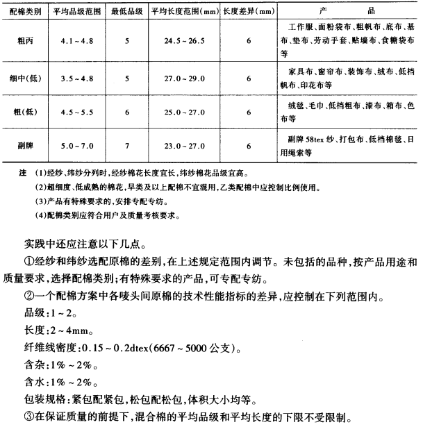 应按纱线线密度、成纱用途及加工特点的不同选配原棉。