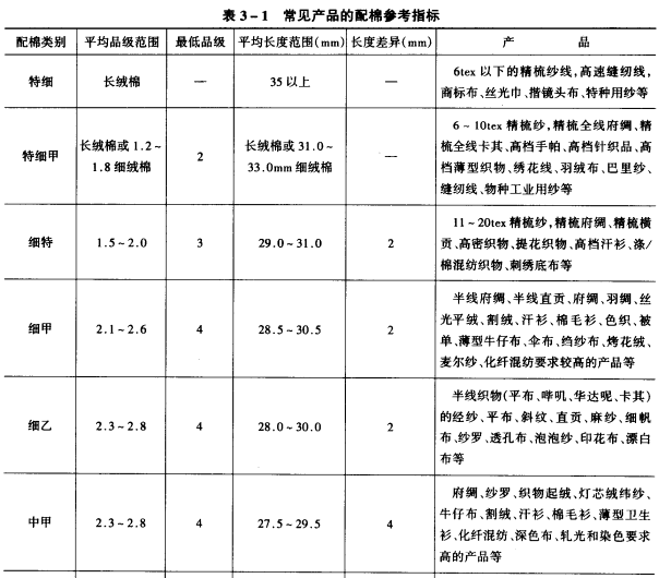 (2)细特纱:细持纱多用于高档织物或股线,成纱质量要求较高。所以应选择色泽洁白、品级较高(1.5—2.8级)、成熟度适中、纤维强力较高、线密度较小、长度较长(28—31mm)、整齐度较好和杂质疵点较少的原棉。