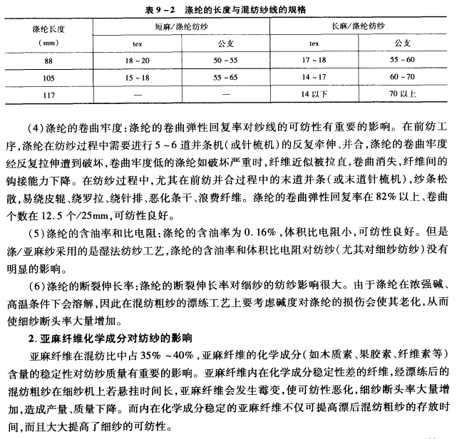 (3)涤纶的线密度:涤纶的线密度与亚麻纤维漂练后的线密度应相近。亚麻纤维漂练后的线密度为5—6.67dtex(1500—2000公支)左右,可选用2.78—3.33dtex(2.5—3旦)涤纶与亚麻纤维混纺,选用2.78—3.33dtex(2.5—3旦)涤纶对提高成纱品质有明显的效果。涤纶的长度与混纺纱线的规格见表9—2所示。