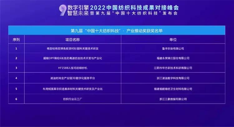 全自动罩杯口罩生产线等9个项目获得“中国十大纺织科技·新锐科技奖”;棉型经纬双弹免熨烫衬衫面料关键技术研发等6个项目获得“中国十大纺织科技·产业推动奖”;耐久型绿色多功能阻燃涤纶长丝直纺技术等8个项目获得“中国十大纺织科技·绿色先锋奖”。