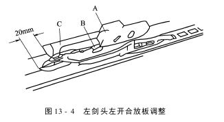 (1)在调整左剑头左开合板A的位置时,注意左剑头通过时其压线板只要能打开1mm就足够了,避免左剑头造成不必要的磨损,如图13-4所示。