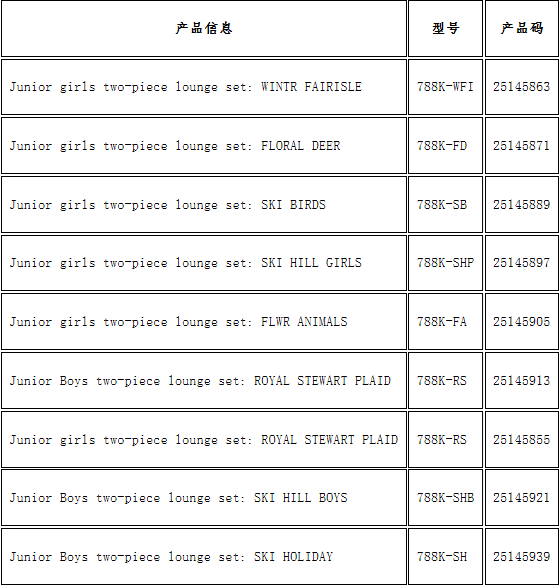 此次召回产品为SportingLife的9款两件套儿童睡衣。睡衣为100%纯棉制,尺码适合8-18岁儿童,男女装均有。