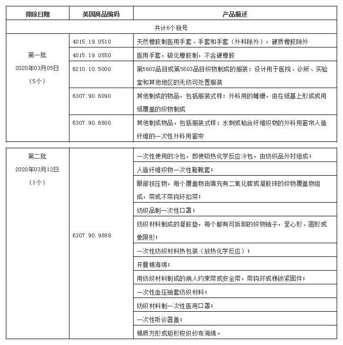 美国当地时间2020年3月12日,美国贸易代表办公室(USTR)公布第二批3000亿美元加征关税商品清单项下的产品排除公告,批排除的8个税号(其中5个为纺织服装税号,详见下表)为完全排除,这次排除新增税号3926.90.9990、6307.90.9889、8479.89.6500、9004.90.0000项下的部分排除产品,都是医疗相关用品,其中包括纺织服装产品1个税号:6307.90.9889。被排除的产品在出口美国时将不再被加征7.5%的关税。本公告列明的被排除产品的有效期为2019年9月1日至2020年9月1日。