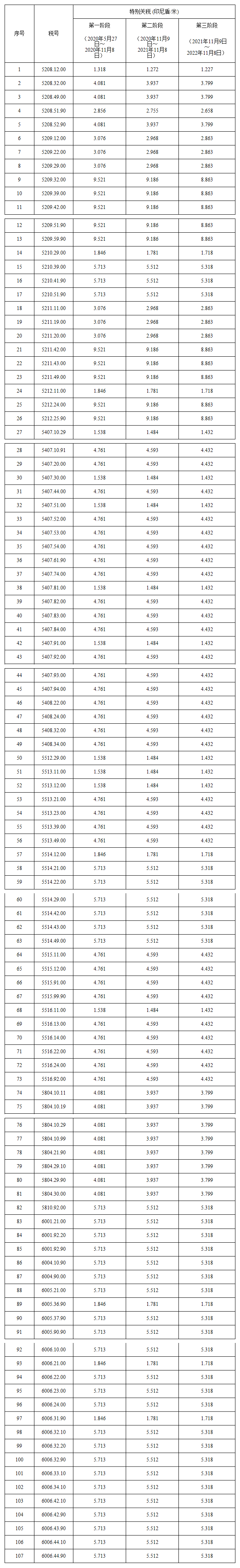 2020年3月3日,WTO保障措施委员会发布印尼代表团于2月28日向其提交的保障措施通报。印尼调查机关对进口织物(Fabrics)作出保障措施终裁,建议对进口织物自2020年5月27日至2022年11月8日以特别关税形式实施保障措施(详见下表)。